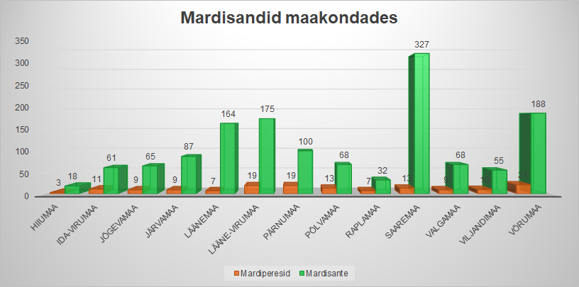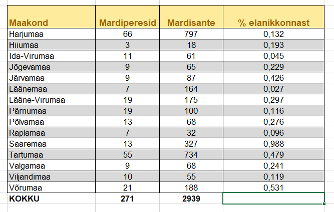 - Enim mardisante pani end kirja Raplamaalt (17,3%), sellele järgnesid Harjumaa (15,7%), Tartumaa (13,9%) ja Ida-Virumaa (13,3%).
